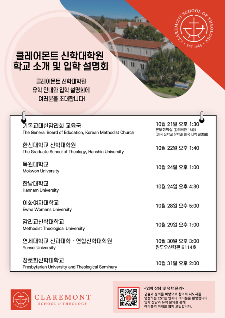클레어몬트 신학대학원 유학 상담 및 입학 설명회(10/21~10/31/2024)